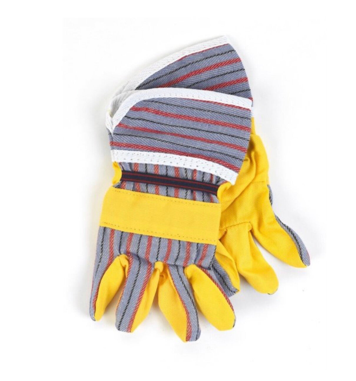 Vrolijke gekleurde werkhandschoenen, zo kan de jonge bouwer veilig werken.