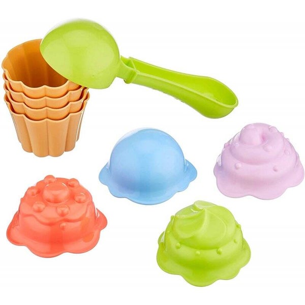 Lekker cupcakes maken van zand met deze set. Met Vier zandvormpjes en een ijsschep kun je gelijk aan de slag als zandcupcakebakker