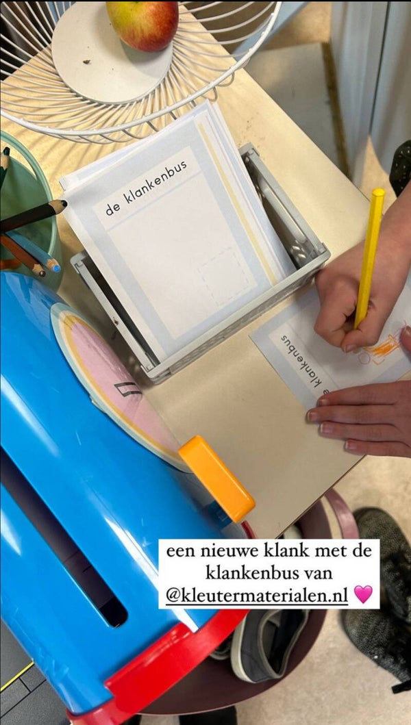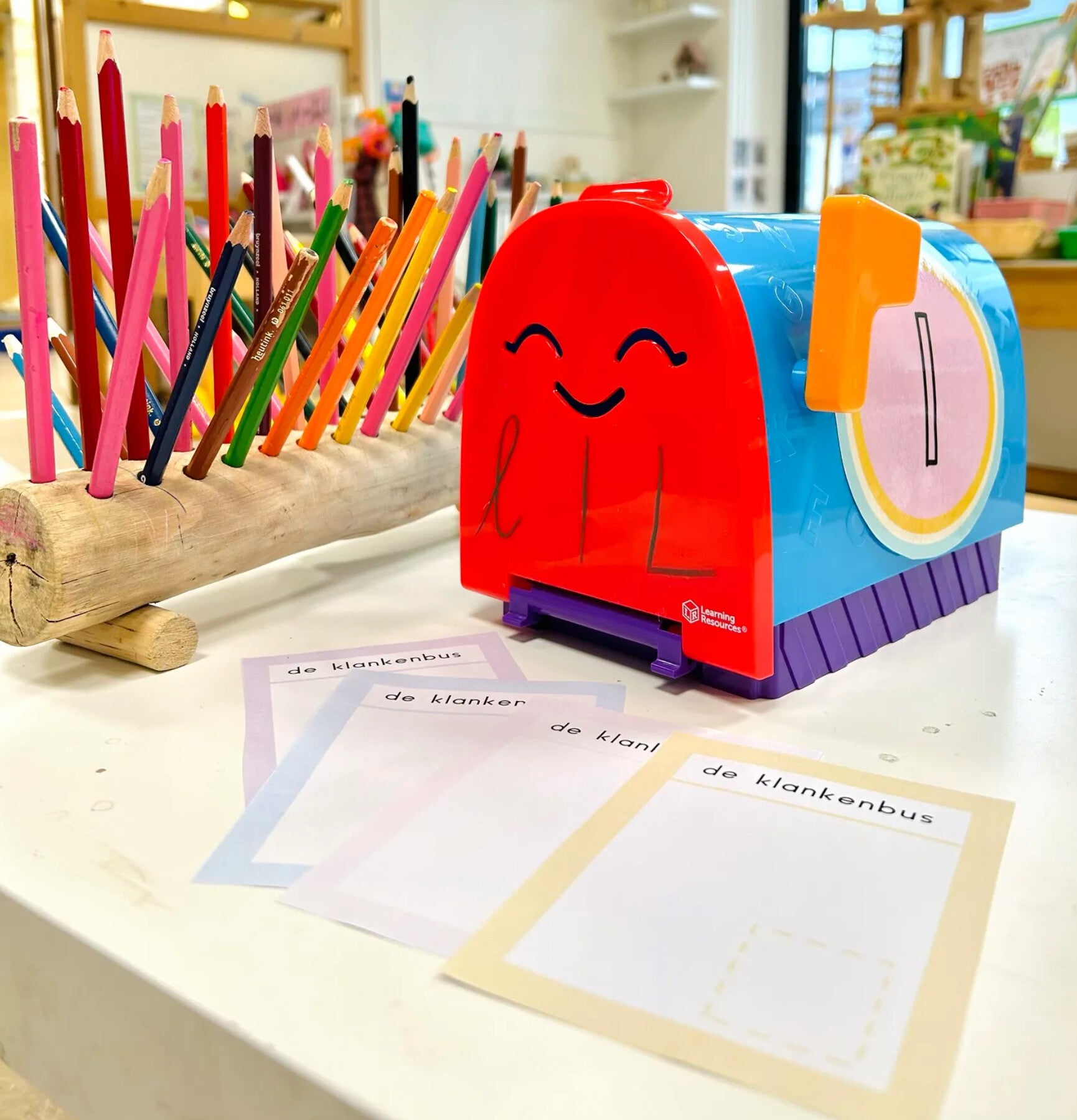 De brievenbus bevat Engelstalige opdrachtkaarten, juf Joni heeft hierbij een klankenbundel met Nederlandstalige activiteiten.