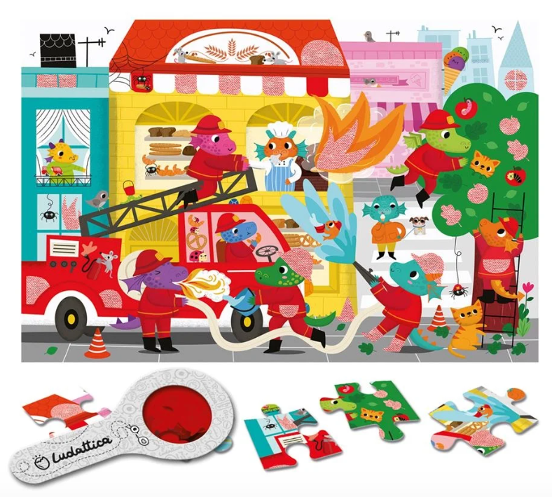 Ontdek de geheimen bij de brandweer! Dat is nog eens leuk puzzelen. Eerst heb je het plezier van de puzzel maken die bestaat uit 24 stevige kartonnen stukjes. Daarna kan je met de bijgeleverde speciale lens geheimen ontdekken in de puzzel. Wat zie jij allemaal bij de brandweer? De puzzel is verpakt in een mooie stevige kartonnen doos zodat je hem na het spelen weer goed kan opbergen.
