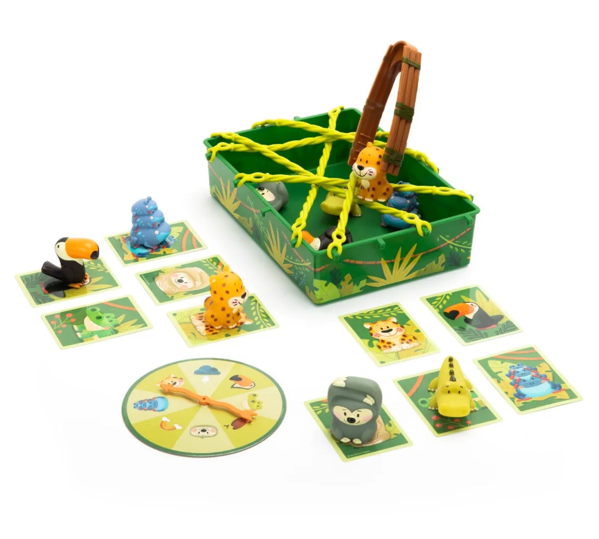 Gebruik je fijne motoriek om je junglevrienden te redden van de gedraaide wijnstokken! Draai voor je beurt. Gebruik het reddingsgereedschap, de pincet om het bijpassende dier te redden van de draaiende wijnstokken. De eerste speler die van elk dier een verzamelt, wint! Pas de moeilijkheidsgraad aan door de wijnstokken aan te passen; hoe meer je gebruikt, hoe moeilijker het is! Het gebruik van het pincet helpt kinderen van 3 jaar en ouder bij het ontwikkelen van fijne motoriek en de kleine spieren die nodig zijn om een potlood vast te houden, een schaar te gebruiken, Inclusief tien dierenspelstukken, tien kaarten, acht aanpasbare wijnstokken, pincetgereedschap, spelbak, spinner en gids. Voor 1-2 spelers.