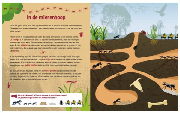 Het boek begint eerst met een educatief stuk over het onderwerp. Hier kom je ook gelijk de kartonnen zaklamp tegen. Vervolgens begint er een verhaal met dikgedrukte woorden. Deze dikgedrukte woorden staan onderaan de pagina afgebeeld. De rechterpagina is nu nog donker, maar als je de zaklamp hier achter plaatst ontstaat er een lichtbundel, net echt! Met de zaklamp kan er samen gezocht worden naar de afgebeelde dikgedrukte woorden.