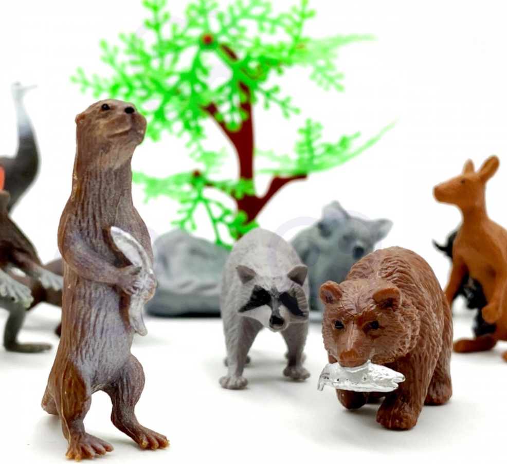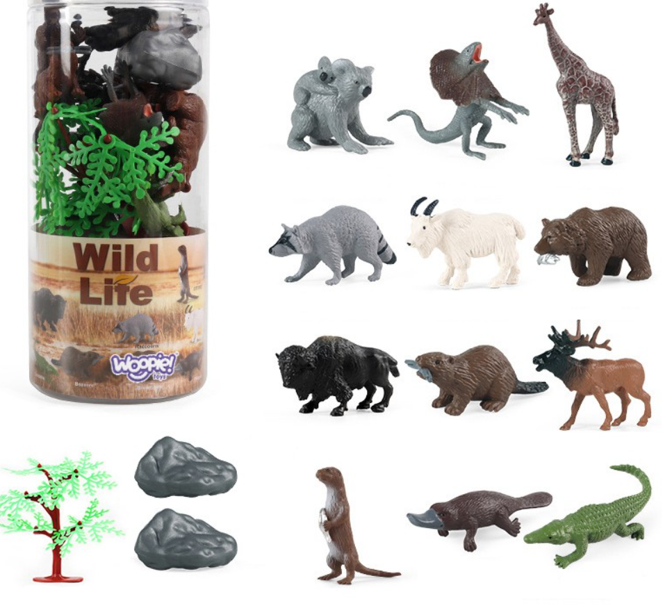 De set bevat 12 wilde dieren , een boom en 2 rotsen . Realistisch ogende beeldjes zullen de verzameling van een kleine verzamelaar uitbreiden, een educatieve functie vervullen en voor veel plezier zorgen , waardoor de peuter de reikwijdte van zijn verbeeldingskracht en creativiteit zal vergroten.