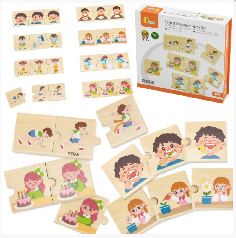 De houten match-action puzzel van VIGA is een puzzel waarbij het kind 8 sets kleurrijke puzzels moet matchen met activiteiten die kinderen in het dagelijks leven doen : handen wassen, tanden poetsen, bloemen water geven, rennen, eten, een sneeuwpop bouwen , genieten van verjaardagen terwijl je kaarsjes uitblaast of puzzelt. Dit is geweldig speelgoed voor kinderen waarmee ze hun kennis over het herkennen en beschrijven van een bepaalde activiteit kunnen leren en consolideren. Dankzij deze puzzelset hebben we veel mogelijkheden om relaties met ons kind te ontwikkelen . Help kinderen de volgorde van alledaagse activiteiten te begrijpen en vaardigheden op het gebied van logisch redeneren en verhalen vertellen te ontwikkelen. Een geweldige manier om nieuwe woordenschat, concentratie en motorische vaardigheden bij jonge kinderen te ontwikkelen en associaties en relaties te creëren . De basisfunctie van deze puzzel is niet alleen leren. Daarnaast ondersteunt het: perceptie, concentratie, fijne motoriek en visuele coördinatie . Dit is een extreem ontwikkelingsspeelgoed!
