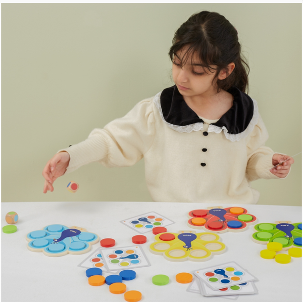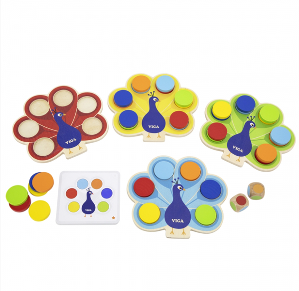 Bij het speelgoed "Match the Colors - Peacock Tail " van het merk Viga worden schijven in de staart van de pauw geplaatst volgens de instructies op de kaarten die aan de set zijn bevestigd, of worden de gaten gevuld met gekleurde blokken volgens de hints die op de dobbelstenen worden gegooid. Dit spel helpt bij het leren van kleuren , ontwikkelt de fijne motoriek en de hand-oogcoördinatie bij het kind door plezier te combineren met leren volgens de Montessori-trend . Samen spelen is iets dat de verbeeldingskracht het beste ontwikkelt, wat zo belangrijk is op deze leeftijd , en tegelijkertijd het kind perfect voorbereidt op het toekomstige kleuteronderwijs.