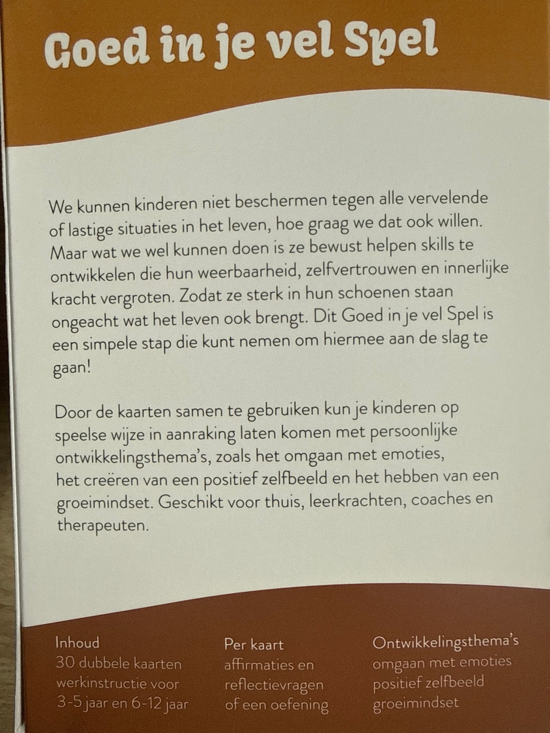 Dit Goed in je vel-spel bestaat uit 30 kleurrijk geïllustreerde kaarten waarin diversiteit centraal staat. Elke kaart bevat één of meerdere reflectievragen, positieve affirmaties of creatieve opdrachten. De set wordt geleverd met een duidelijke handleiding voor gebruik.