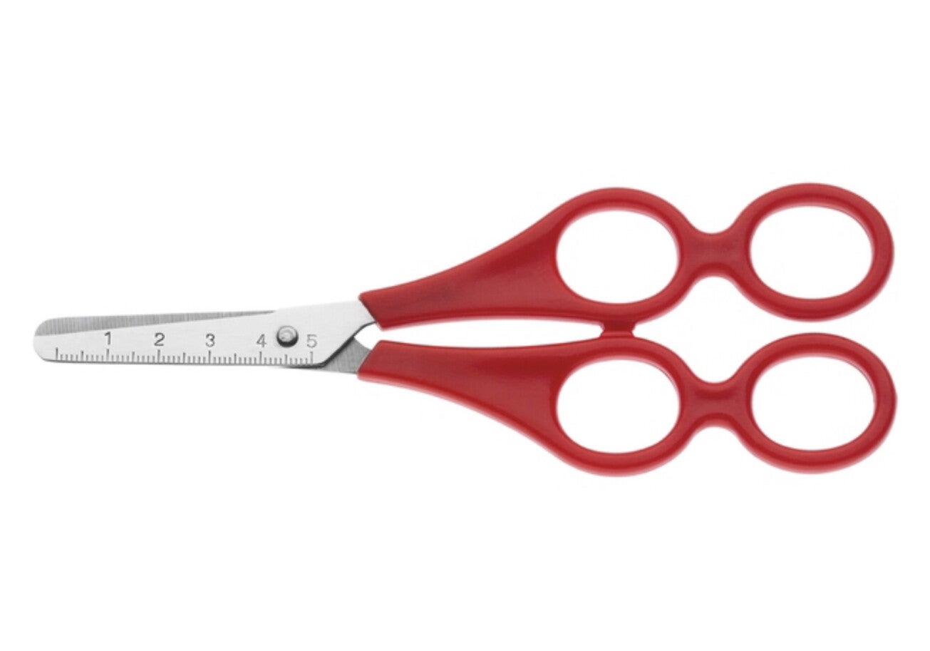 Met ronde punt en dubbele handgreep. Geschikt vanaf circa 4 jaar. Voorzien van 5 cm schaalindeling. 13 cm. Schaar voor rechtshandigen.