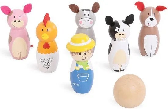 Deze set is niet alleen leuk op de thematafel, maar kan ook gebruikt worden als kegelset. Alle kegels hebben de vorm van een boerderijdier waaronder een varken, hond, koe, kip, ezel, boer en een houten balletje.
