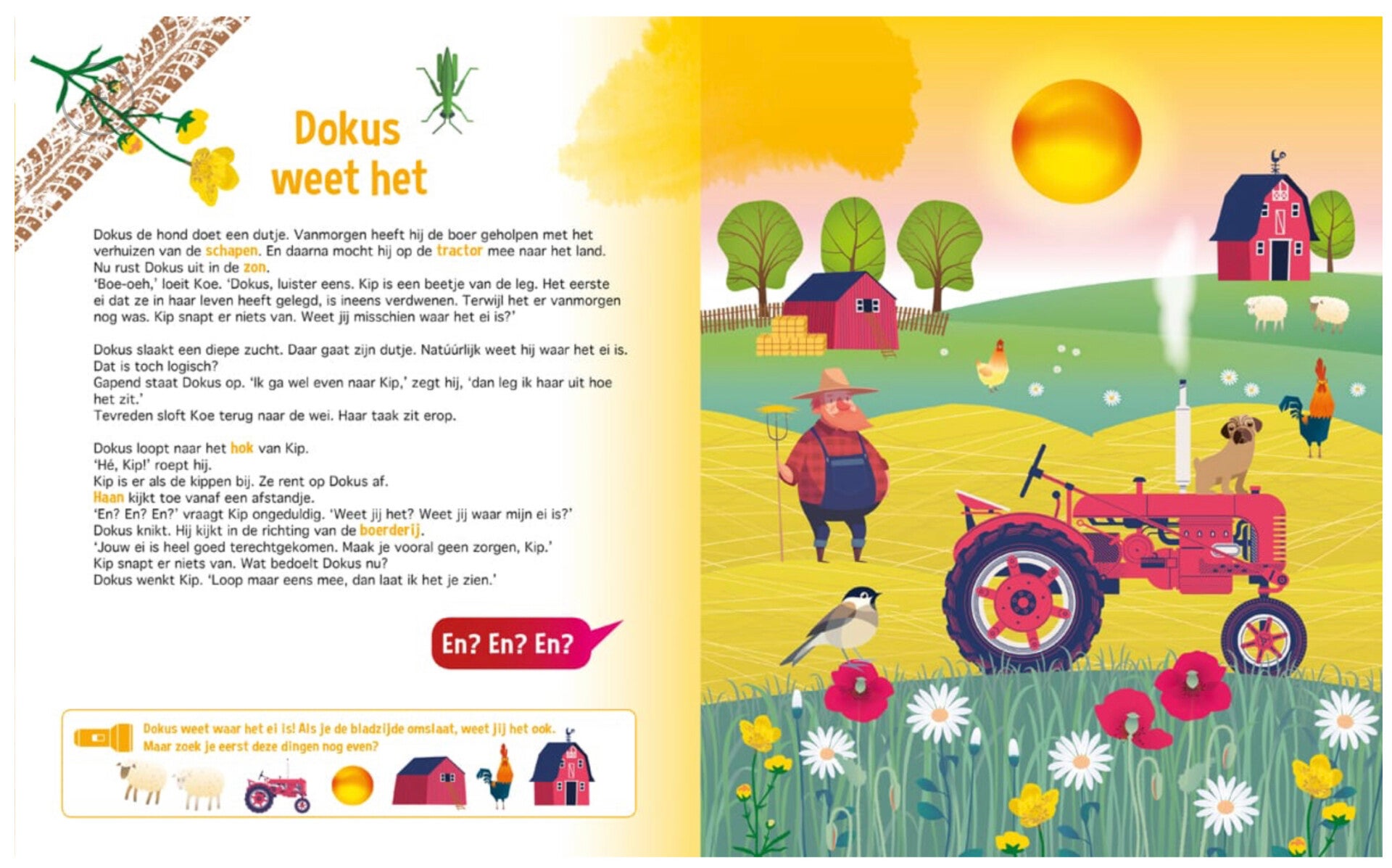Het boek begint eerst met een educatief stuk over het onderwerp. Hier kom je ook gelijk de kartonnen zaklamp tegen. Vervolgens begint er een verhaal met dikgedrukte woorden. Deze dikgedrukte woorden staan onderaan de pagina afgebeeld. De rechterpagina is nu nog donker, maar als je de zaklamp hier achter plaatst ontstaat er een lichtbundel, net echt! Met de zaklamp kan er samen gezocht worden naar de afgebeelde dikgedrukte woorden. Zo lees je samen interactief een boek.