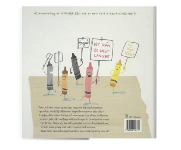 In De krijtjes staken van Drew Daywalt Oliver Jeffers heeft Teun een probleem. Hij wil een tekening maken, maar als hij zijn kleurdoos opendoet vindt hij daarin alleen een stapel brieven. De brieven komen van zijn kleurkrijtjes, die staken. Zwart wil voor meer dan alleen de lijntjes worden gebruikt en Beige wil niet meer in de schaduw staan van Bruin. Blauw heeft behoefte aan rust na alle rivieren, oceanen en luchten waaraan hij heeft meegewerkt. Ook Rood klaagt dat hij te veel moet doen, terwijl Roze juist graag eens wat vaker ingezet zou willen worden. Kan Teun zijn krijtjes kalmeren en een oplossing bedenken waar iedereen blij mee is?
